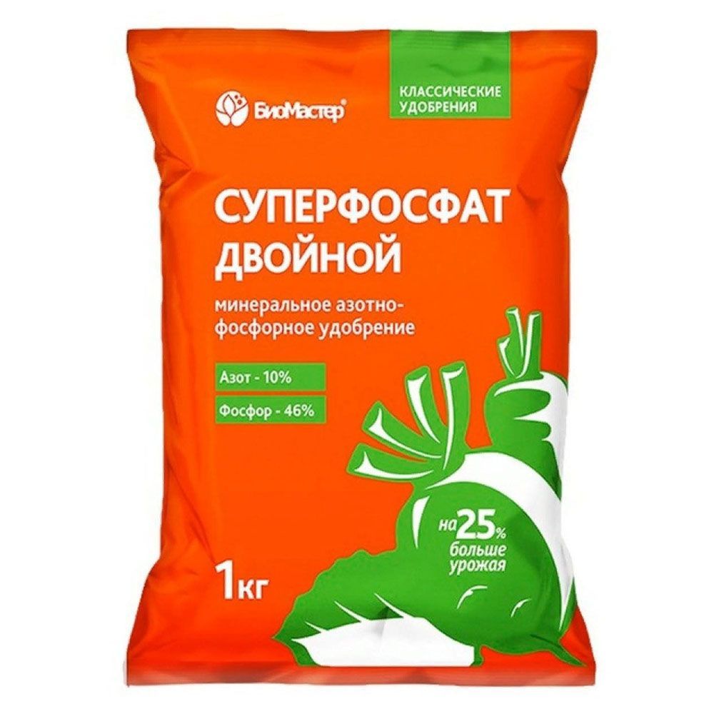 Удобрение более концентрированное (содержит больше ДВ - действующего вещества) и содержит меньше балластных компонентов (а именно сульфата кальция - гипса) чем простой суперфосфат. А это значит, что продукт более эффективне в сравнении с суперфосфатом. Двойной суперфосфат NPK 12:46:0 рекомендуется использовать для подготовки грунта под посадку. Вносят его весной или осенью. Стоит помнить, что это фосфорное удобрение с длительным периодом усвоения из-за малой растворимости фосфатов кальция в составе (дигидрофосфат).